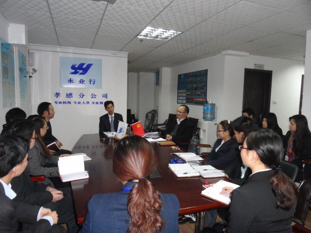 近日,孝感市政协领导莅临永业行孝感分部视察 2014-01-16 近日,孝感市政协常务副主席喻楚林及副主席周良斌,市政协副主席、民建市委主委陈鸿杰,市委统战部副部长、市政协人口资源环境和城市建设委员会主任程建华,市政协人口资源环境和城市建设委员会副主任高国平、社会和法制委员会副主任冯艳等莅临永业行孝感分部视察并指导工作。 公司总裁潘世炳、副总裁肖锋、孝感分部总经理张立胜热情接待了喻主席一行。视察期间,喻主席一行听取了潘总对永业行发展历程、业务范围、公司规模、技术力量、行业地位、近期业绩、长远目标等基本情况。喻主席等对永业行2013年取得的业绩表示祝贺,对孝感分部积极参政议政予以了充分肯定,并对永业行的未来寄予厚望。此外,喻主席等对永业行的发 MORE